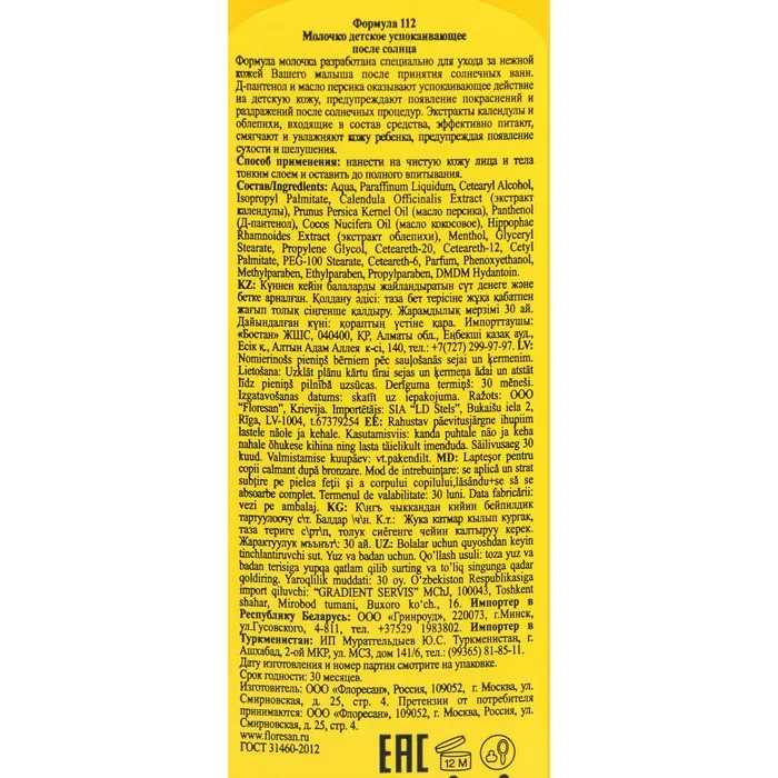 Детское успокаивающее молочко после солнца — это идеальное средство для бережного ухода за нежной кожей ребёнка после активного отдыха на свежем воздухе. Оно помогает восстановить кожу, увлажняет и дарит ощущение комфорта. Лёгкая текстура быстро впитывается, не оставляя липкости, а формула с натуральными компонентами заботится о коже, делая её мягкой и гладкой.