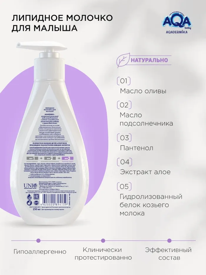 AQA Dermika – уникальный пошаговый уход, разработанный с учётом всех потребностей атопичной кожи ребенка во все фазы проявления проблем детской кожи с первых дней жизни. Шаг 3 "бережная защита" для поддержания атопичной кожи кожи малыша в здоровом виде. Рекомендовано наносить молочко AQA DERMIKA минимум 2-4 раза в сутки, чтобы кожа малыша оставалась увлажнённой. Липидное молочко на основе гидролизованного белка козьего молока, натуральных эмолентов и уникального гидротермального актива способствует защите и поддержанию кожи в здоровом состоянии и восполнению липидного слоя. Облегчает жизнь малыша и его родителей при возникновении проблем детской кожи!
