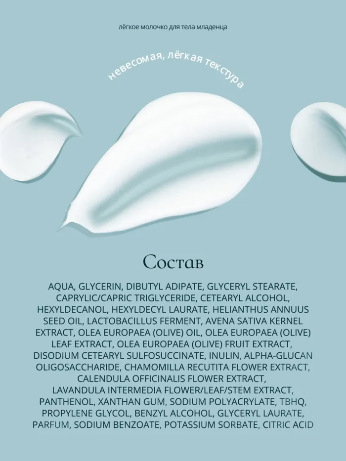 Состав: Aqua, Glycerin, Dibutyl Adipate, Glyceryl Stearate, Caprylic/Capric Triglyceride, Cetearyl Alcohol, Hexyldecanol, Hexyldecyl Laurate, Helianthus Annuus Seed Oil, Lactobacillus Ferment, Avena Sativa Kernel Extract, Olea Europaea (Olive) Oil, Olea Europaea (Olive) Leaf Extract, Olea Europaea (Olive) Fruit Extract, Disodium Cetearyl Sulfosuccinate, Inulin, Alpha-Glucan Oligosaccharide, Chamomilla Recutita Flower Extract, Calendula Officinalis Flower Extract, Lavandula Intermedia Flower/Leaf/Stem Extract, Panthenol, Xanthan Gum, Sodium Polyacrylate, Tbhq, Propylene Glycol, Benzyl Alcohol, Glyceryl Laurate, Parfum, Sodium Benzoate, Potassium Sorbate, Citric Acid.
