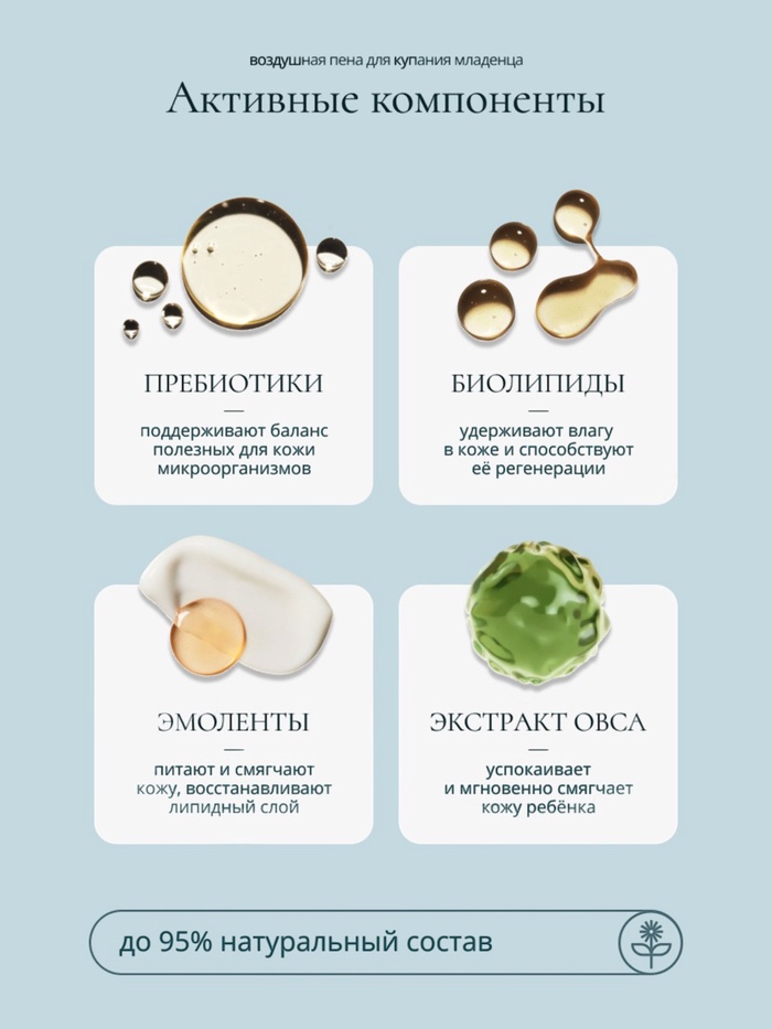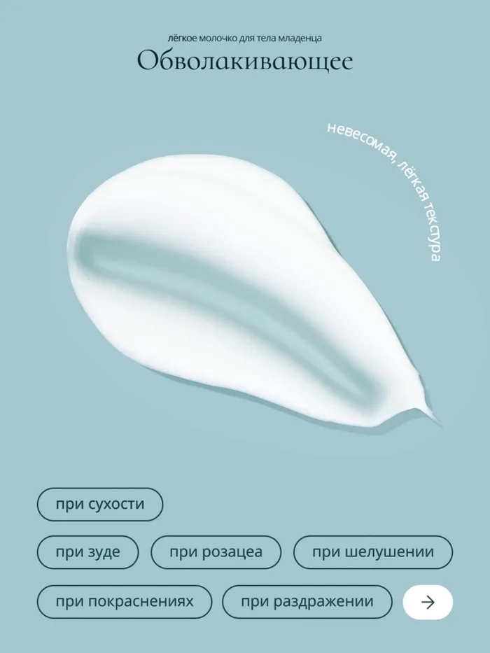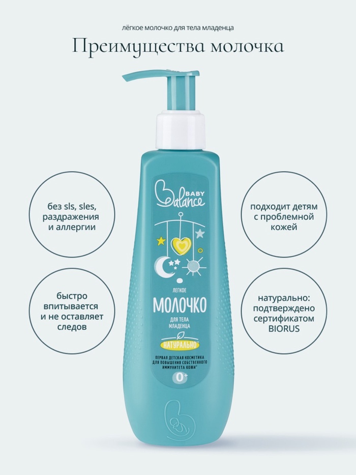 Легкое молочко для тела младенца нежно питает и увлажняет детскую кожу. Экстракт овса мгновенно делает кожу гладкой и препятствует возникновению сухости и шелушений. Гипоаллергенный состав содержит пребиотики для поддержания баланса полезных для кожи микроорганизмов. Масла подсолнечника и оливы восстанавливают структуру липидного слоя. Пантенол успокаивает чувство зуда.