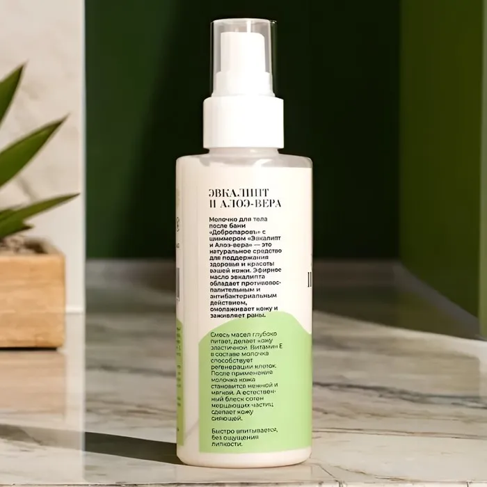 Молочко для тела после бани "Добропаровъ" с шиммером "Бархатный персик" - это натуральное средство для поддержания здоровья и красоты вашей кожи. Эфирное масло эвкалипта обладает противовоспалительным и антибактериальным действием, омолаживает кожу и заживляет раны. Смесь масел глубоко питает, делает кожу эластичной. Витамин Е в составе молочка способствует регенерации клеток. После применения молочка кожа становится нежной и мягкой. А естественный блеск сотен мерцающих частиц сделает кожу сияющей. Быстро впитывается, без ощущения липкости.