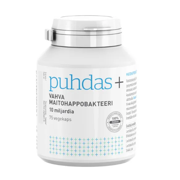 Молочно - кислые бактерии Puhdas+ Vahva поддерживают иммунитет. Содержит штаммы Lactobacillus rhamnosus, Bifidobacterium lactis, Lactobacillus reuteri и Lactobacillus casei. Препарат содержит цинк, который способствует нормальной работе иммунной системы.