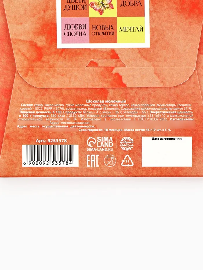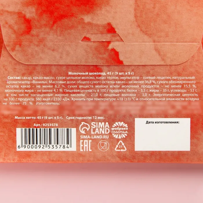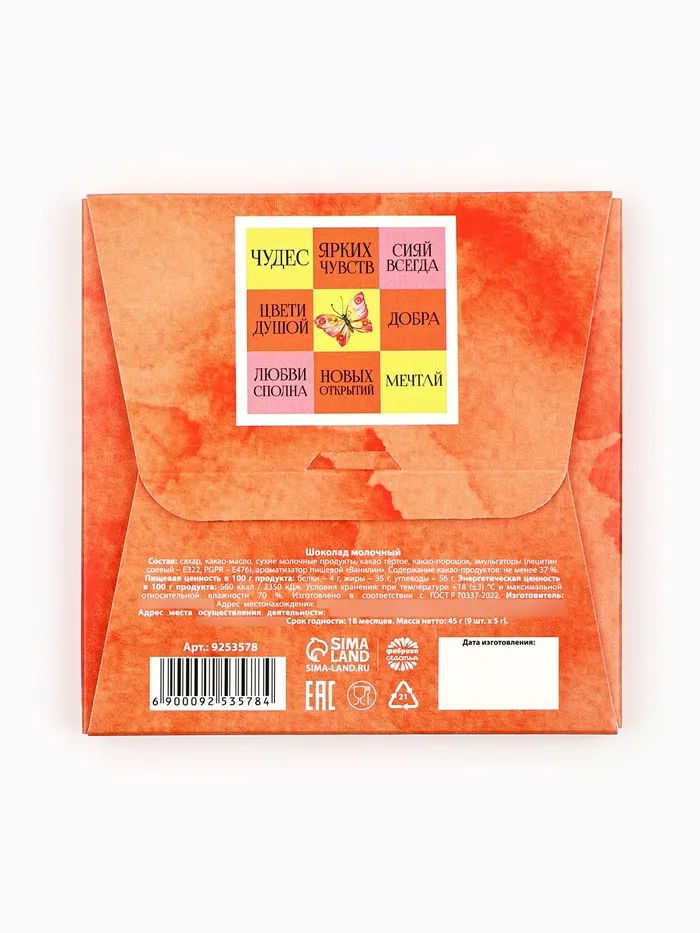 Молочный шоколад «8 марта», 9 шт. х 5 г. — Характеристики