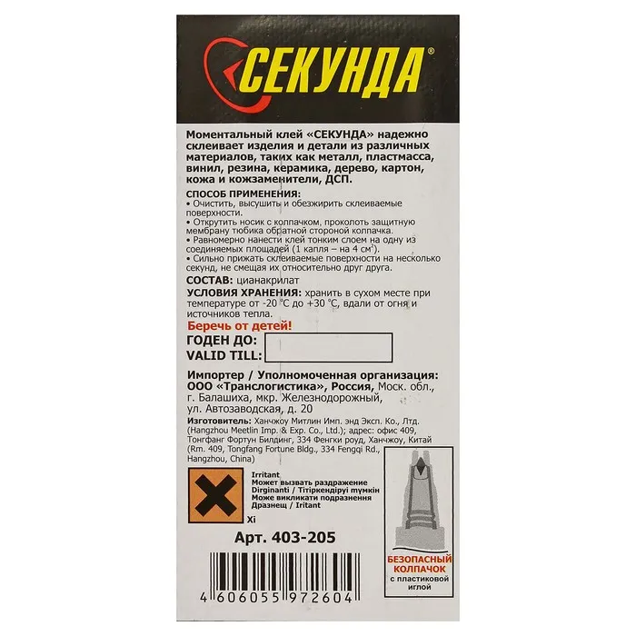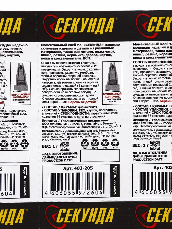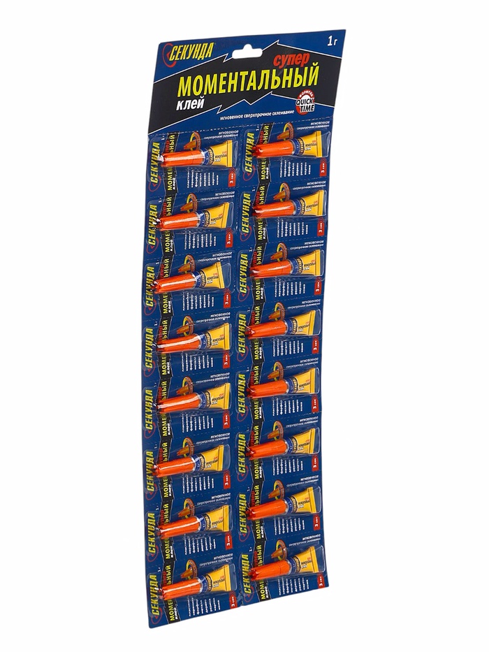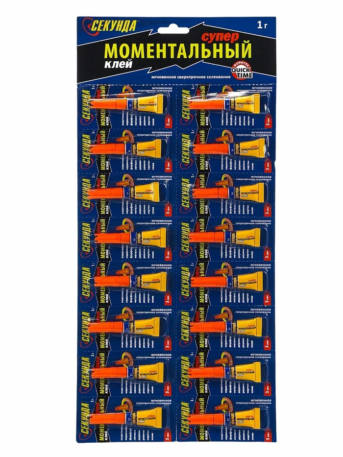 Моментальный клей Секунда 3 г, в индивидуальном блистере 403-110 - это 100% цианакрилат.