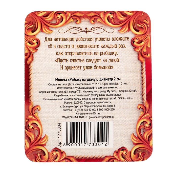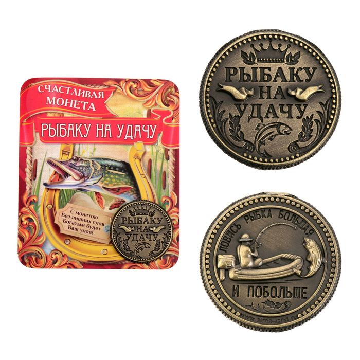 Монета сувенир «Рыбаку на удачу», d=2 см. — Характеристики