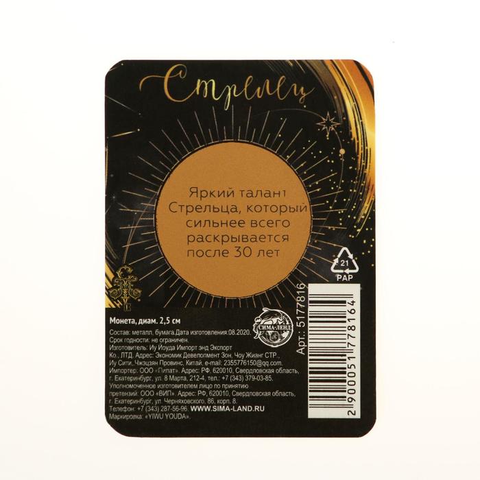 Монета сувенир знак зодиака «Стрелец», d=2,5 см. — Характеристики