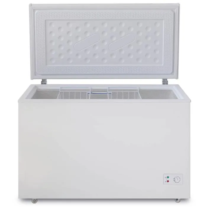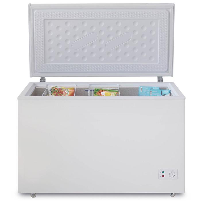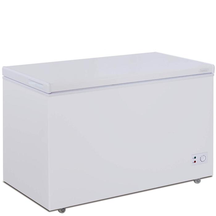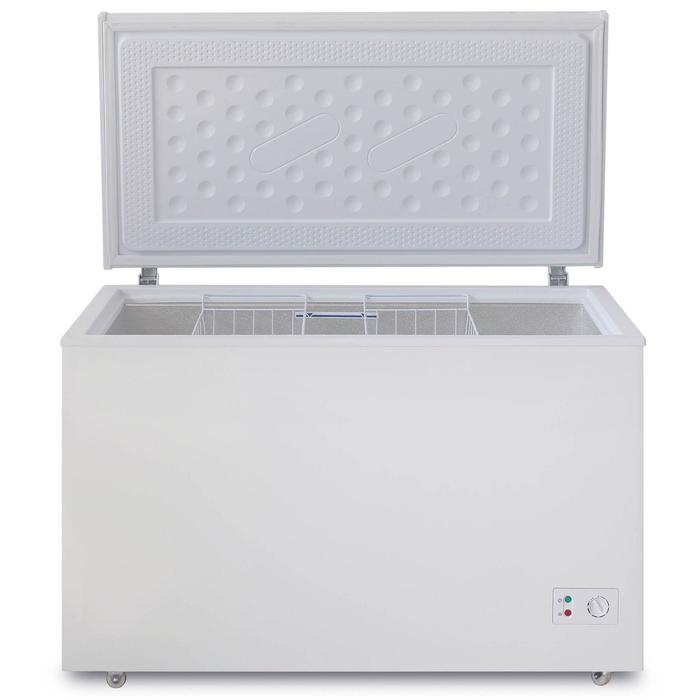 Морозильник-ларь «Бирюса» 355 KX оснащён электромеханическим управлением и одним компрессором. Морозильная камера размораживается вручную. Минимальная температура морозильной камеры составляет -18 С°.