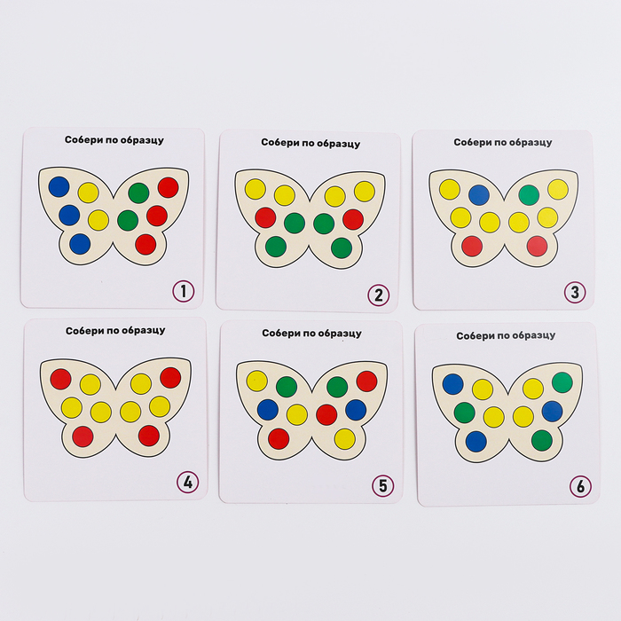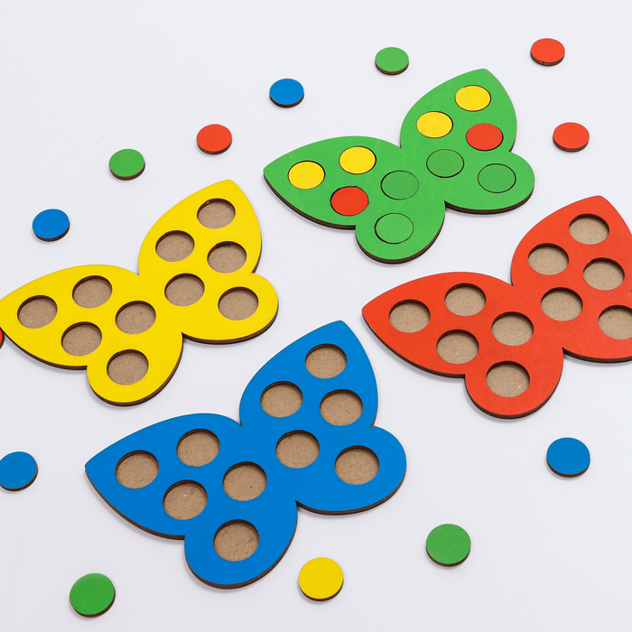 • Сортируйте кружочки по цветам и вкладывайте в бабочек соответствующего цвета.