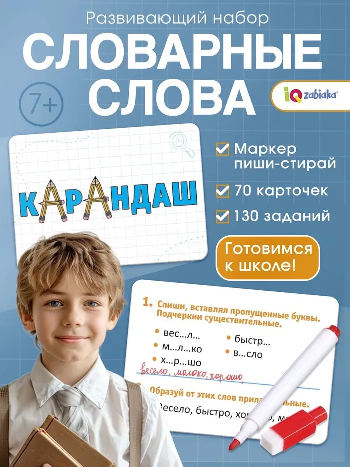 Развивающий набор «Словарные слова», 70 карточек, маркер, 7+
