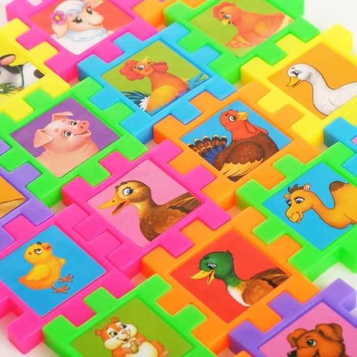 В наборе входят 18 ярких и красочных деталей с изображением животных.