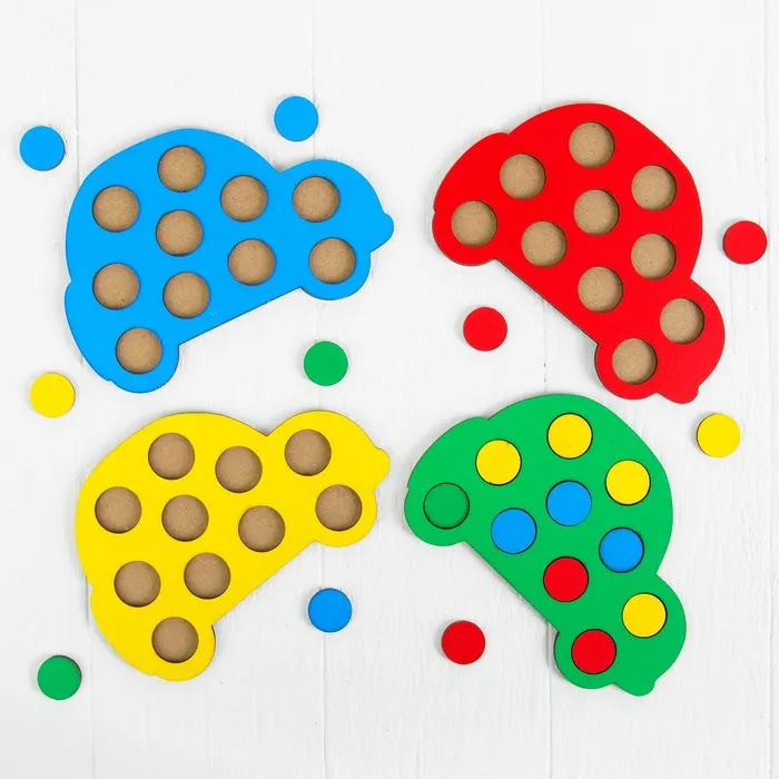 - Сортируйте кружочки по цветам и вкладывайте в машинки соответствующего цвета.