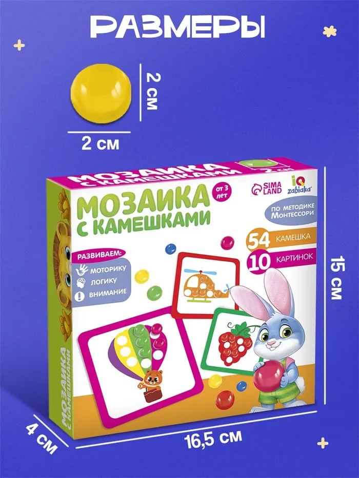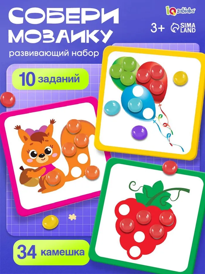 Марблс «Мозаика с камешками» заменяет несколько пособий — это и мозаика, и сортер, и тренажёр для логики. Камешки можно использовать для счёта, изучения цветов или свободного творчества.