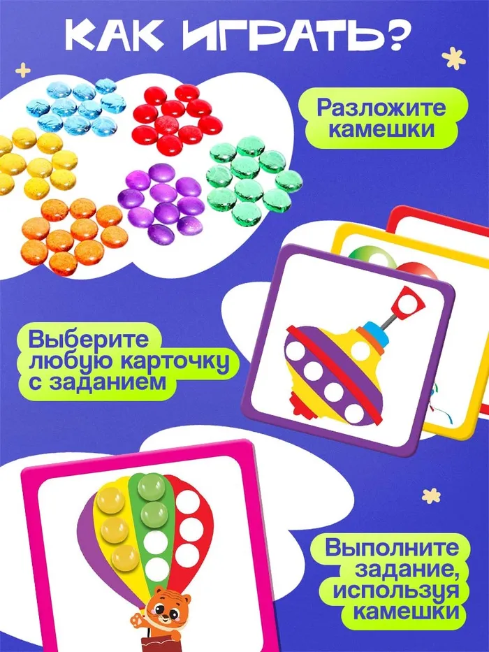 - 54 камешка и 10 заданий — ребёнок выкладывает фигуры по карточкам, тренируя память и пространственное мышление.
