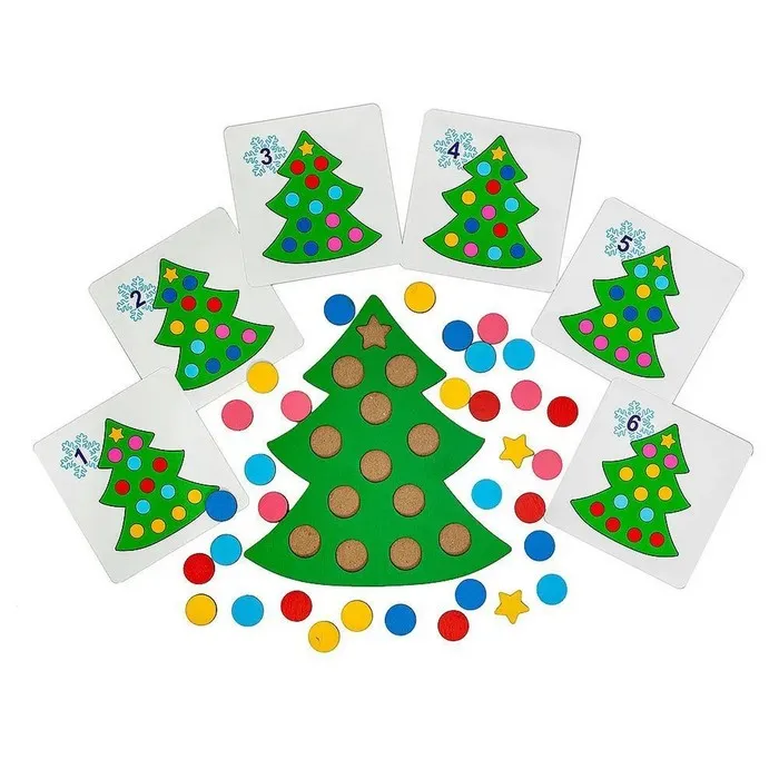 - Задача ребёнка — нарядить ёлочку цветными фишками в соответствии с заданиями на карточках.