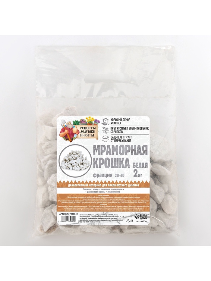 Мраморная крошка "Рецепты Дедушки Никиты", отборная, белая, фр 20-40 мм , 2 кг — Характеристики