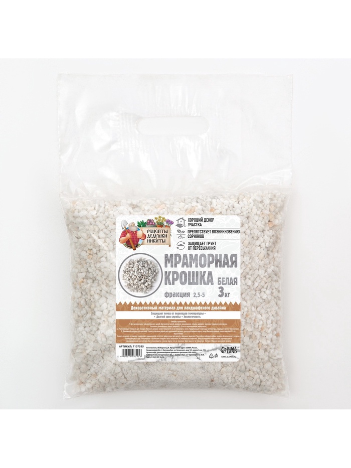 Мраморная крошка «Рецепты Дедушки Никиты», отборная, белая, фр 2.5-5 мм, 3 кг — Характеристики