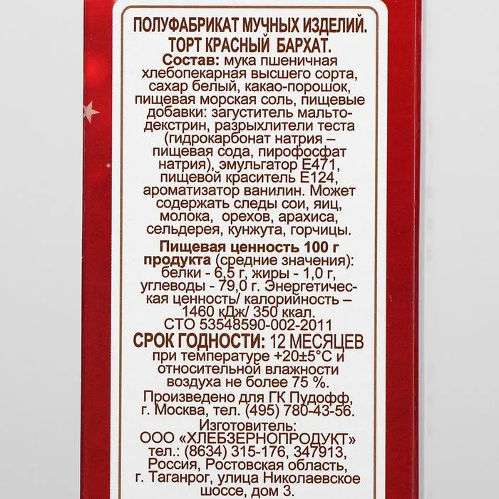 Состав: мука пшеничная хлебопекарная высшего сорта, сахар-песок, какао-порошок, пищевая поваренная морская соль, пищевые добавки: загуститель Е1400, регулятор кислотности - лимонная кислота, разрыхлитель-гидрокарбонат натрия(сода пищевая), эмульгатор Е471, пищевой краситель Е124, ароматизатор ванилин.