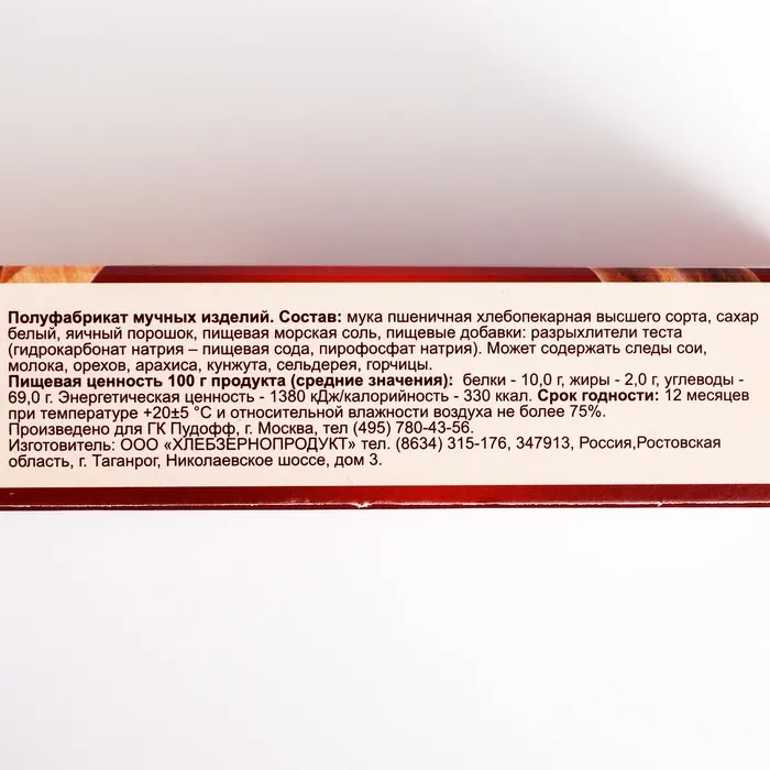 Состав: мука пшеничная хлебопекарная высшего сорта, сахар белый, яичный порошок, пищевая поваренная морская соль, пищевые добавки: разрыхлитель- гидрокарбонат натрия (сода пищевая), регулятор кислотности – лимонная кислота. Может содержать следы орехов, арахиса, сои, сельдерея, горчицы и кунжута.