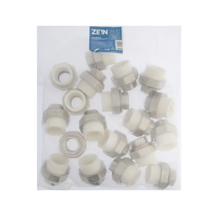 Комбинированная муфта ZEIN, выполненная из полипропилена, представляет собой американку с внутренней резьбой.
