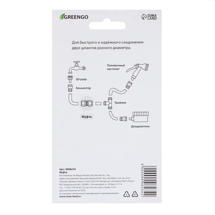 Муфта переходная, для шлангов 1/2" (12 мм) и 3/4" (19 мм), цанговое соединение, прорезиненный пластик, Greengo — Характеристики