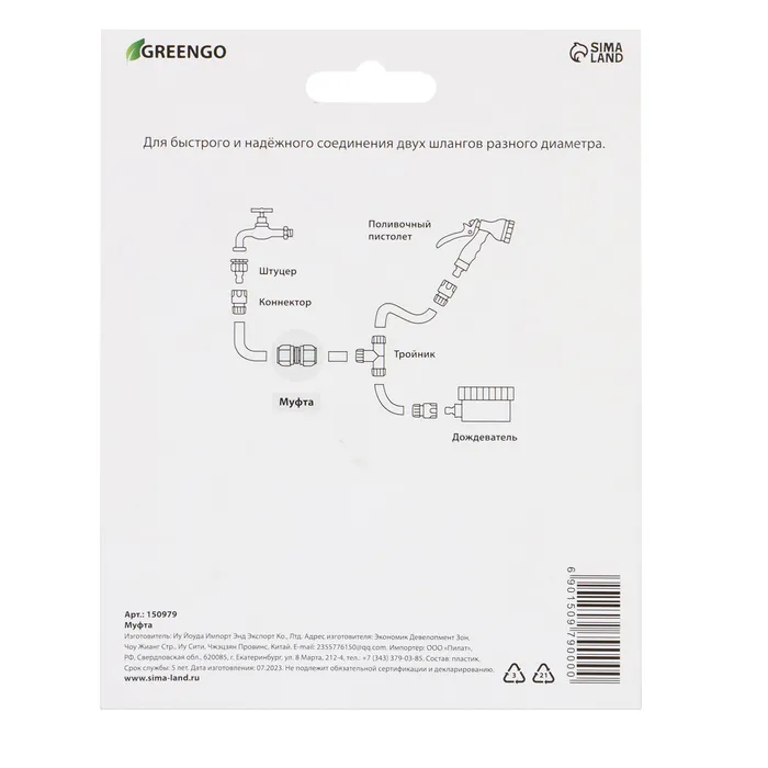 Муфта переходная, для шлангов 3/4" (21 мм) – 1" (25 мм), цанговое соединение, ABS-пластик, Greengo — Характеристики