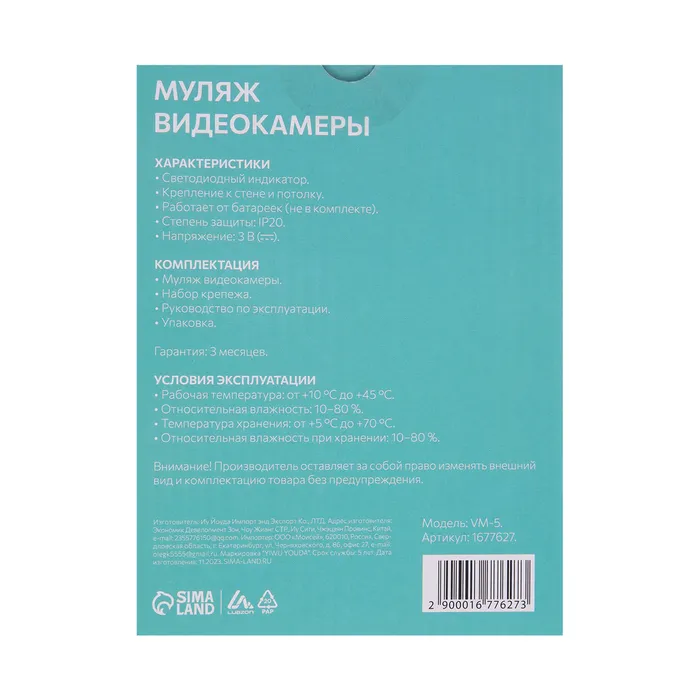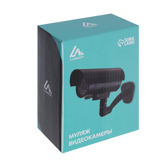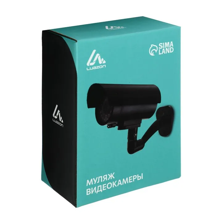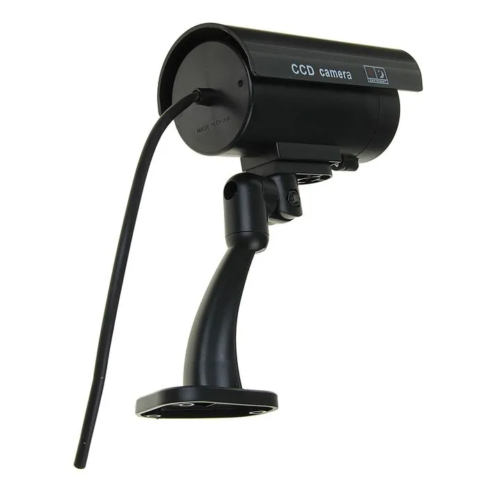 Модель выполнена в виде уличной камеры и оснащена светодиодным индикатором, который имитирует работу настоящего прибора. Наличие провода и надписей делает муляж неотличимым от полноценного охранного устройства.