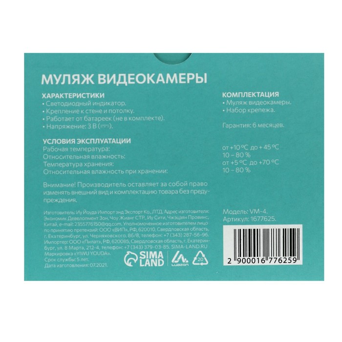 Муляж видеокамеры Luazon VM-4, со светодиодным индикатором, 2хАА (не в комплекте), чёрный — Характеристики