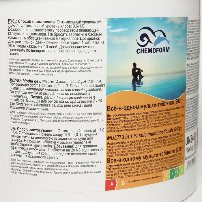 Мультитаблетки 3-в-1 (дезинфекция, коагуляция, борьба с водорослями) для комплексной обработки воды плавательного бассейна. Служит для комплексной обработки воды плавательного бассейна. Основной функцией препарата является непрерывная дезинфекция воды, а дополнительными функциями — борьба с водорослями и помутнением воды. «Мульти-таблетки» содержат стабилизатор, препятствующий ускоренному распаду хлора в жаркую и солнечную погоду.