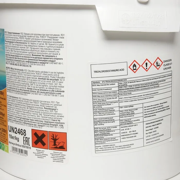 Состав: трихлоризоциануровая кислота 970мг/г, сульфат меди 10мг/г, сульфат алюминия 10мг/г, борная кислота 10мг/г, препарат содержит не менее 80% активного хлора.
