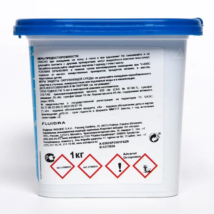 Описание: медленно растворимые многофункциональные таблетки на основе стабилизированного хлора, в состав которых входят так же альгицид и флокулянт: не только обеспечивают эффективную дезинфекцию, но и предотвращают появление водорослей и мутности, обеспечивая кристальную чистоту воды.