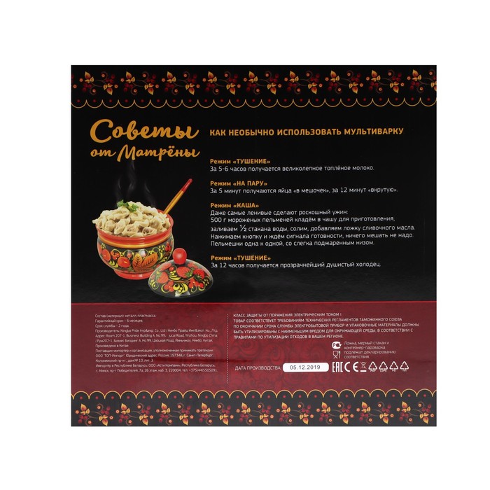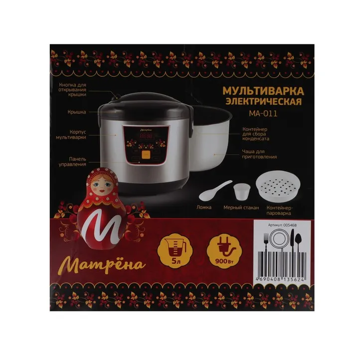 Мультиварка МАТРЁНА MA-011, 900 Вт, 5 л, 11 программ, антипригарное покрытие, чёрная — Характеристики