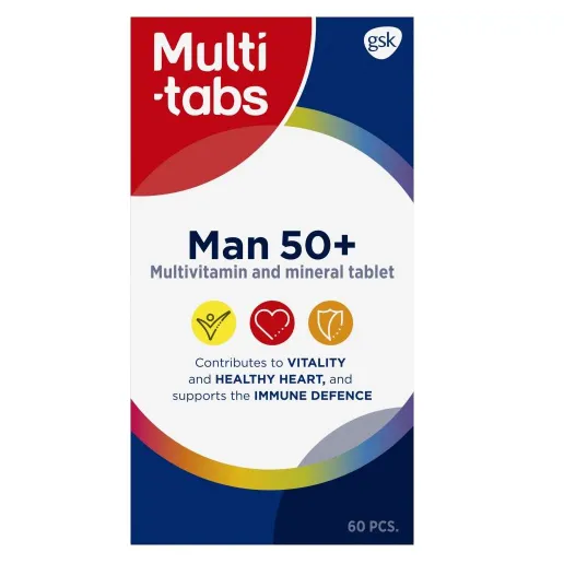Multi-tabs Man 50+ содержат комбинацию витаминов и минералов, предназначенных для мужчин старше 50 лет, таких как витамин В12, который способствует нормальному функционированию психики, и цинк, который способствует поддержанию нормального уровня тестостерона в крови.