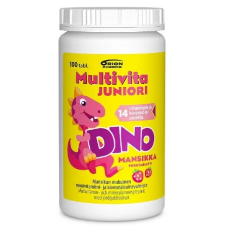 Multivita Dino Junior - это жевательная мультивитаминная таблетка в форме динозавра со вкусом клубники. Секрет хорошего вкуса заключается в натуральном клубничном ароматезаторе, а краситель получают из свеклы.
