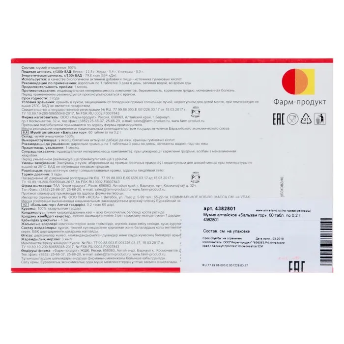 Мумие алтайское «Бальзам гор», 60 табл. по 0,2 г. — Характеристики