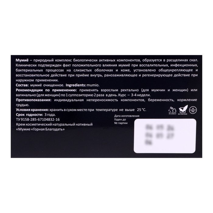 Мумиё ректально-вагинальное – 100% очищенное мумиё в форме суппозиториев. Мумиё алтайское обладает выраженным противовоспалительным, ранозаживляющим, противоотёчным, антибактериальным действием на внутренние слизистые.