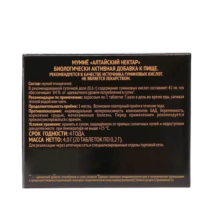 Мумиё «Алтайский нектар» восполняет в организме дефицит гуминовых кислот: в рекомендованной дозе 0,6г их содержание составляет 37,2 мг или 74,4% от суточной потребности.