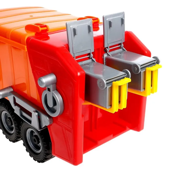 - Работающий механизм загрузки: боковой подъёмник легко опрокидывает два съёмных мусорных бака в кузов. Ребёнок может повторять за взрослыми, создавая свои сценарии уборки города.