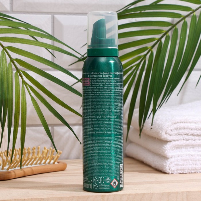 Мусс для укладки волос с экстрактом бамбука, экстрафиксаци великолепно фиксирует укладку и надежно сохраняет ее в течение всего дня, без склеивания и утяжеления. Идеальная укладка, сильные, красивые и здоровые волосы. Отлично справляется со сложными прическами. Экстракт бамбука делает волосы эластичными, сильными, защищает их от воздействия окружающей среды, содержит UV фильтры. Придает им живой блеск и сияние.