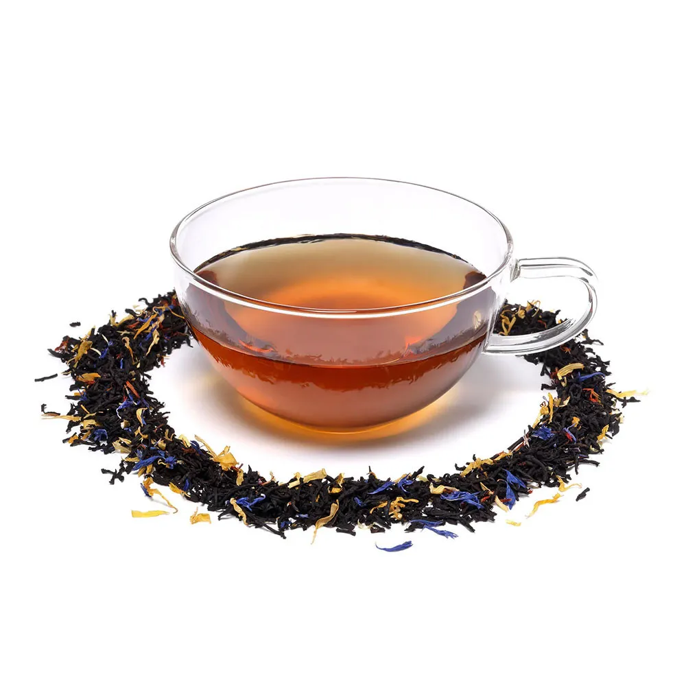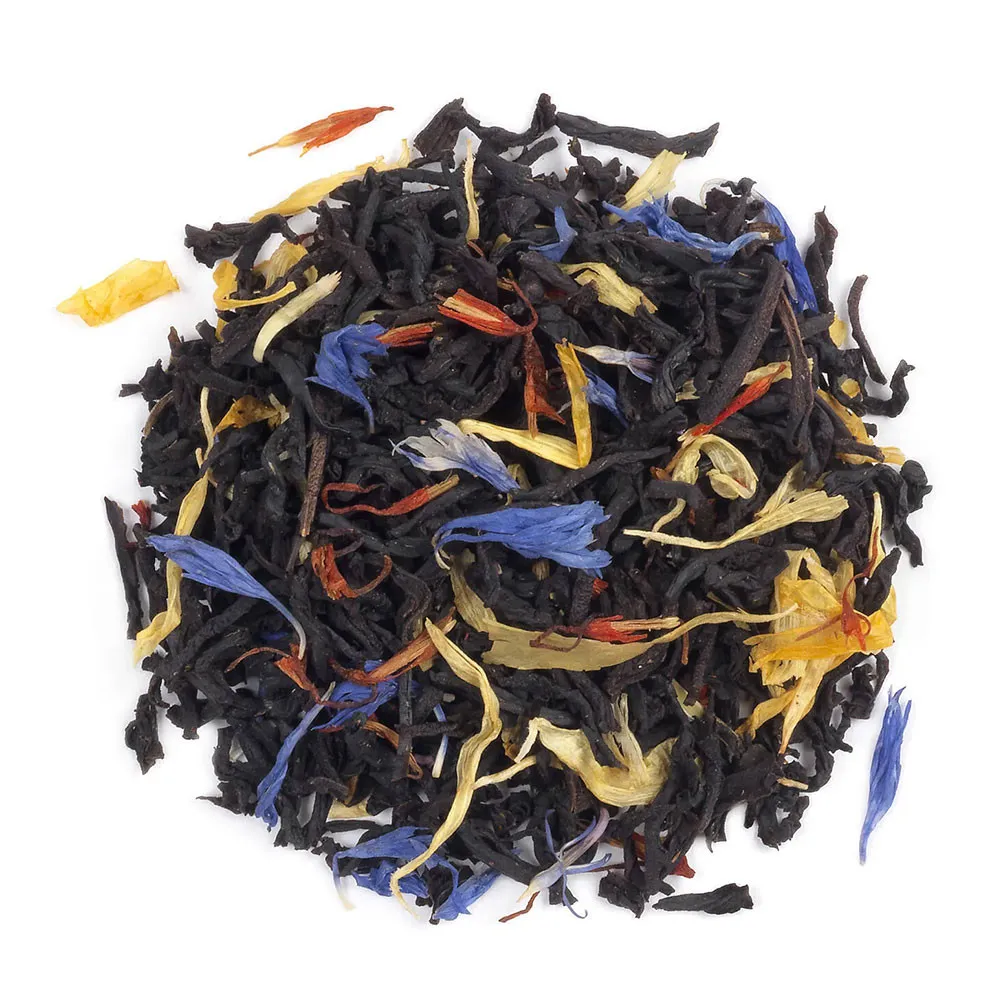 Ингредиенты: чёрный чай, ароматизаторы, 4 % лепестков бархатца, сафлора и василька.