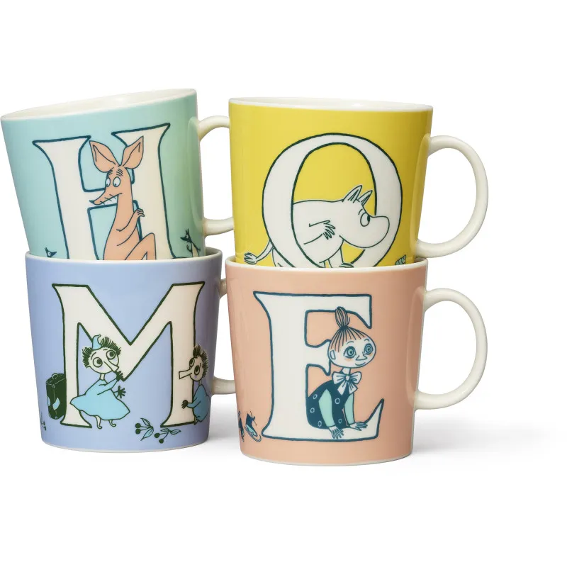 На чашке O изображено, как конец света угрожает Долине Муми, и начинают происходить странные события. Жители решают выяснить, в чем дело. Иллюстрация на обратной стороне большой чашки из коллекции ABC вдохновлена комиксом 'Муми-тролль и комета'.