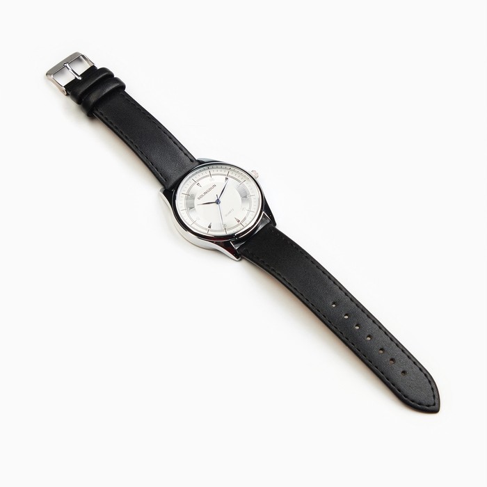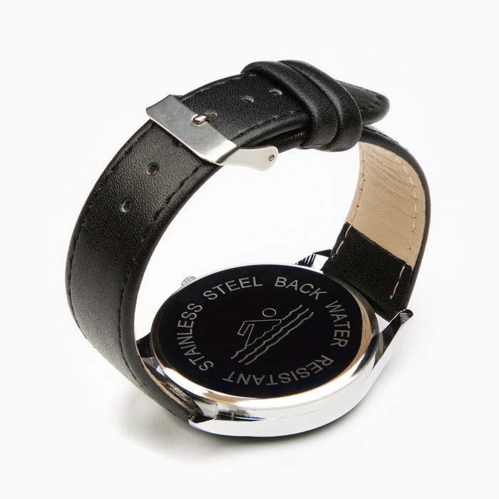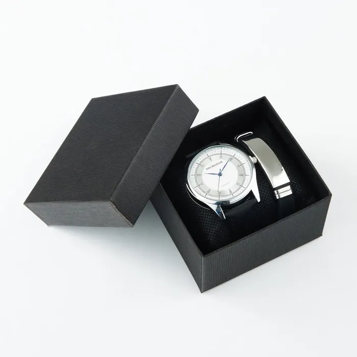 Набор включает наручные часы с циферблатом черного цвета и браслет с массивной бляшкой.