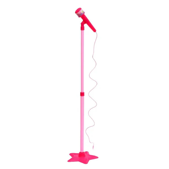 - Высота стойки микрофона регулируется, это даёт возможность подстраивать её под рост малыша. Максимальная высота — 120 см, минимальная — 80 см. Микрофон усиливает звук.