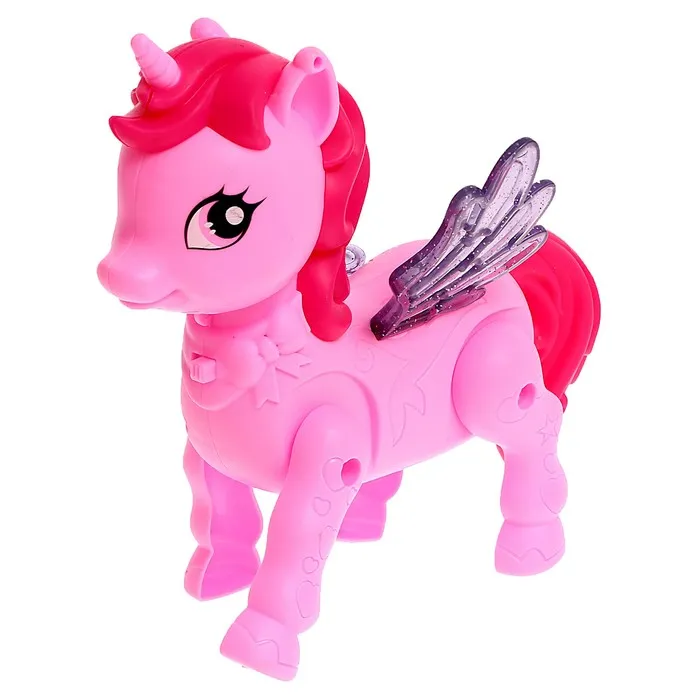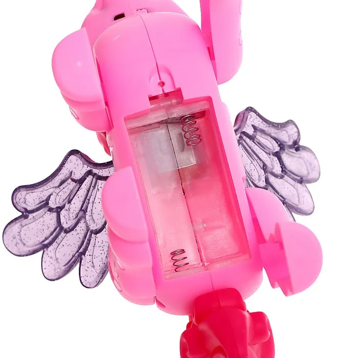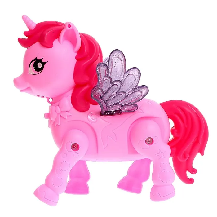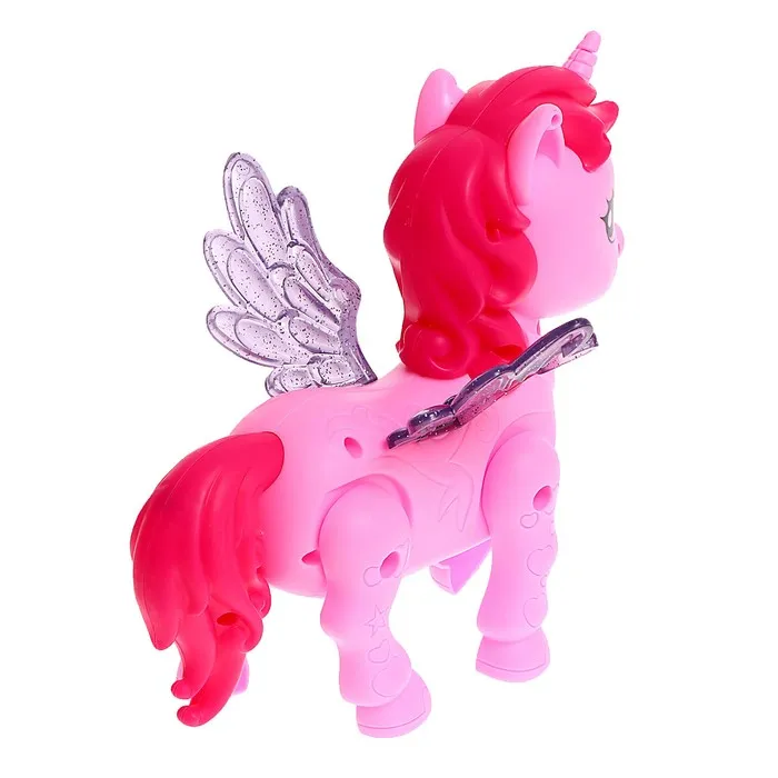 Включите пони, и она начнёт ходить под музыку и весело бегать. Её крылышки ярко светятся.