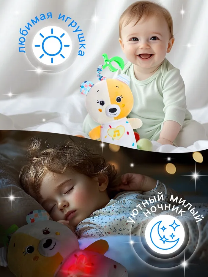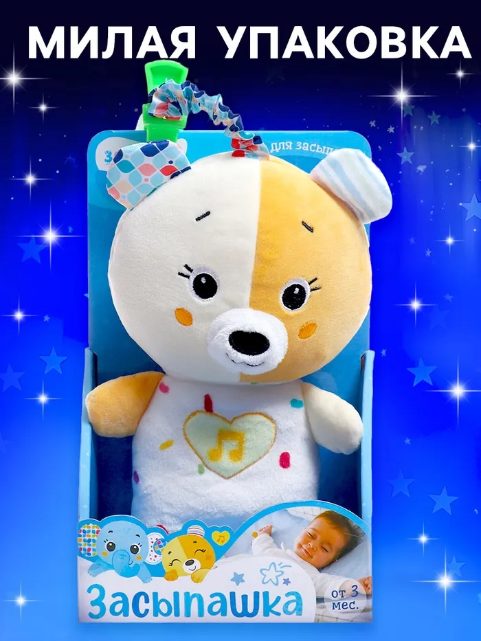 Мягкий плюшевый мишка станет верным спутником малыша в мире снов. Эта игрушка сочетает в себе нежные объятия и успокаивающие звуки, помогая ребёнку расслабиться и быстрее уснуть.