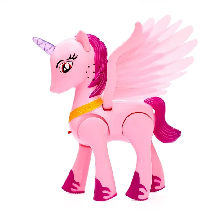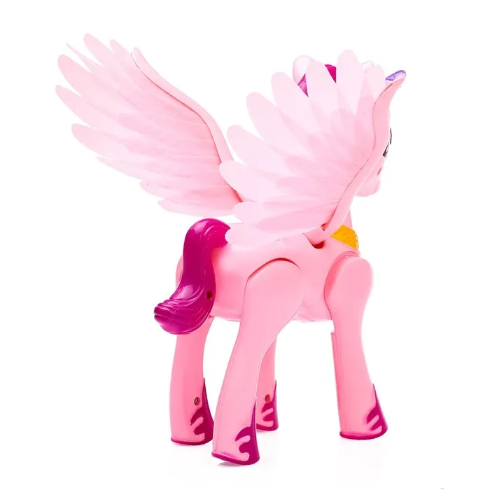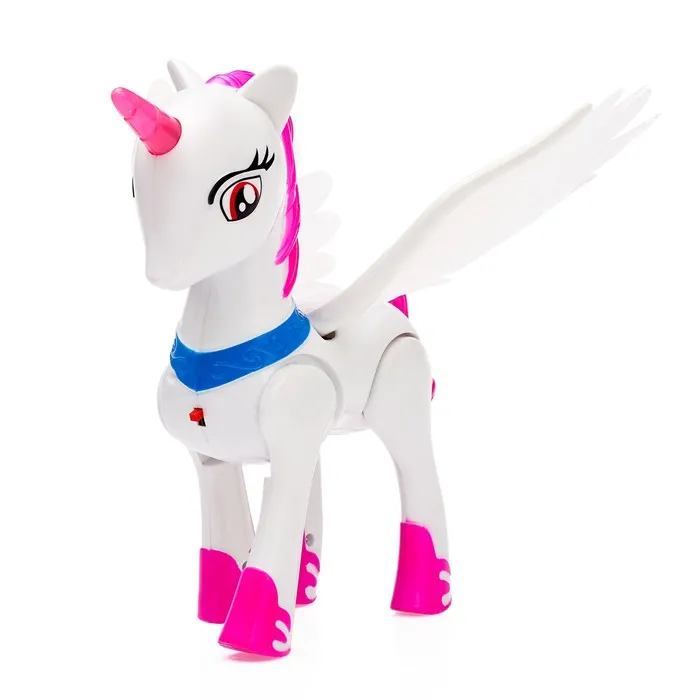 Эта сказочная лошадка не только выглядит необычно, но и имеет волшебные функции. У игрушки светится и мигает разноцветными огнями рог. Лошадка ходит и машет мерцающими крыльями. Игрушка издаёт звуки: цокот копыт и весёлую мелодию.