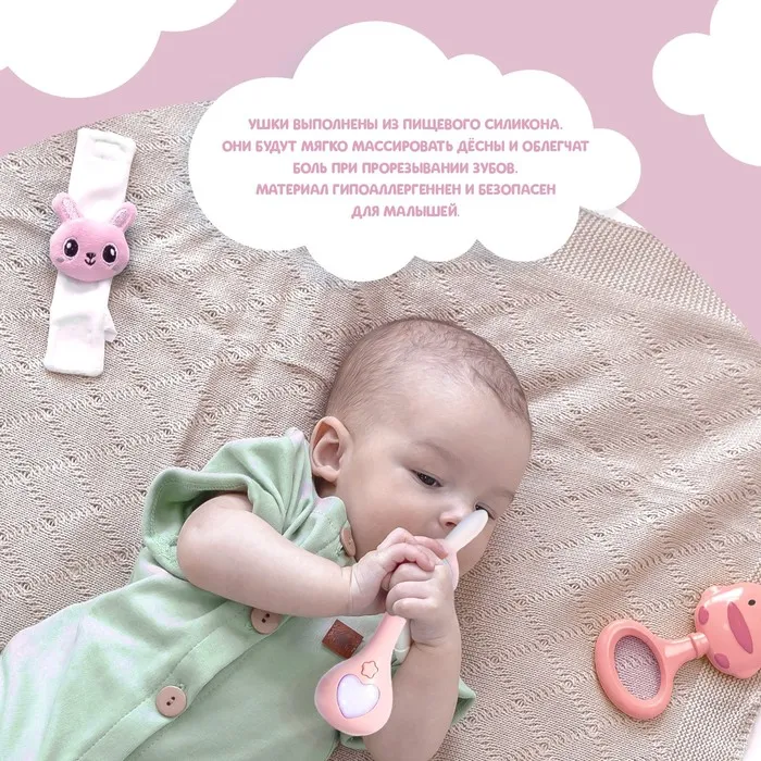 - Ушки выполнены из пищевого силикона. Они будут мягко массировать дёсны и облегчат боль при прорезывании зубов. Такой материал гипоаллергеннен и безопасен для малышей.