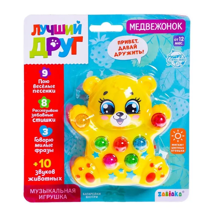 Зверёк воспроизводит весёлые фразы, названия животных и их звуки, песенки, мелодии и забавные стишки.