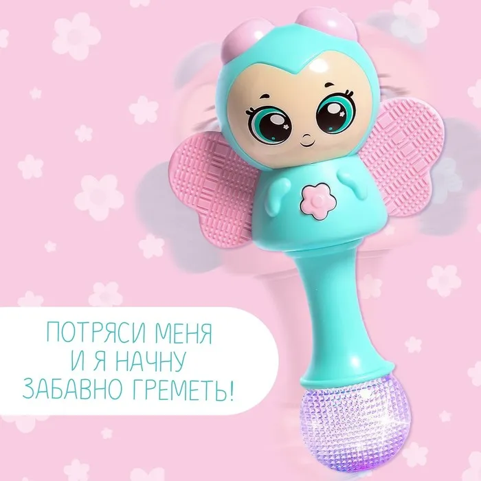 - При взаимодействии с игрушкой ребёнок услышит забавные звуки: есть элемент с гремящими при движении шариками.