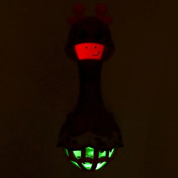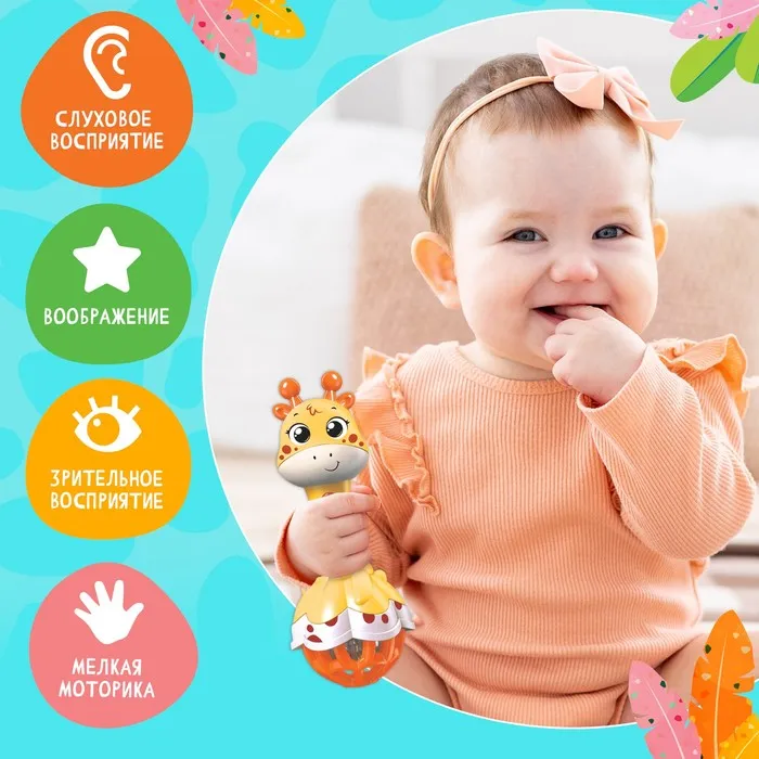 - При взаимодействии с игрушкой ребёнок услышит забавные звуки: внутри жирафика находится элемент с гремящими при движении шариками.
