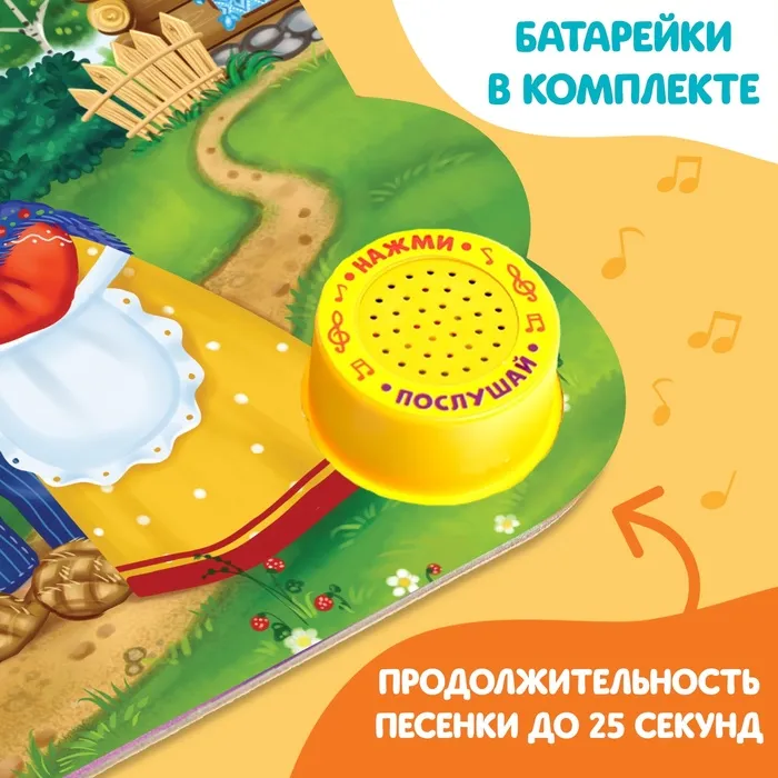 Страницы книги выполнены из плотного картона. Музыкальный чип работает от батареек, входят в комплект. Продолжительность песенки: 20–25 секунд.